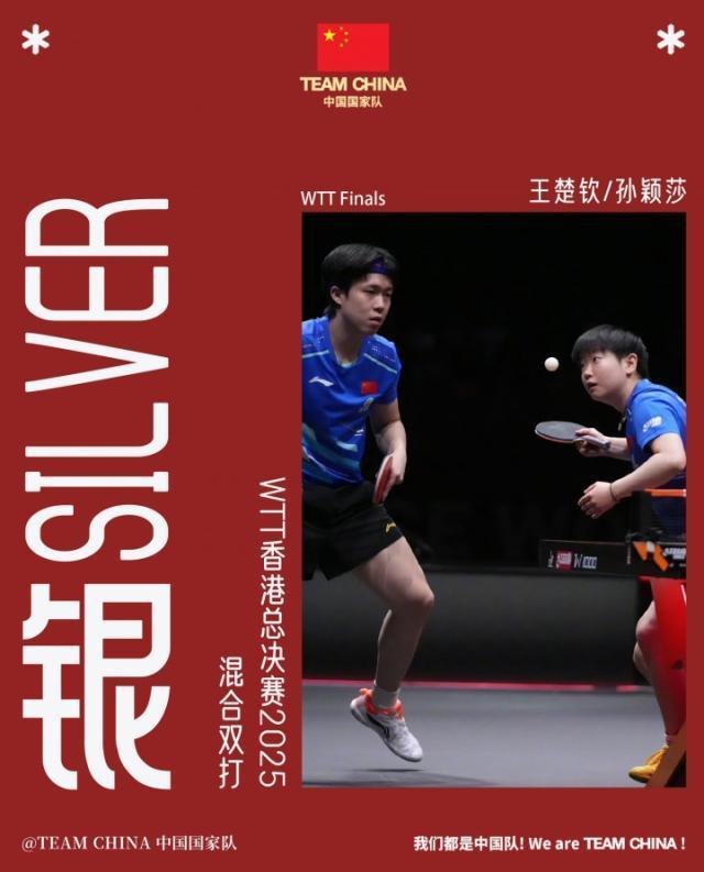 WTT总决赛混双决赛,王楚钦/孙颖莎对阵韩国组合林钟勋/申裕斌,最终一天三赛+带伤作战的孙颖莎搭档王楚钦,以0比3不敌对手,获得亚军。各局比分分别是:9比11、8比11、6比11。2025年WTT总决赛首次增设混双比赛,取消了男双和女双比赛。