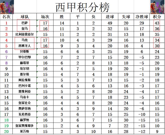- 西甲最新积分战报 巴萨豪夺7连胜领先皇马7分 黑马赢球紧追马竞